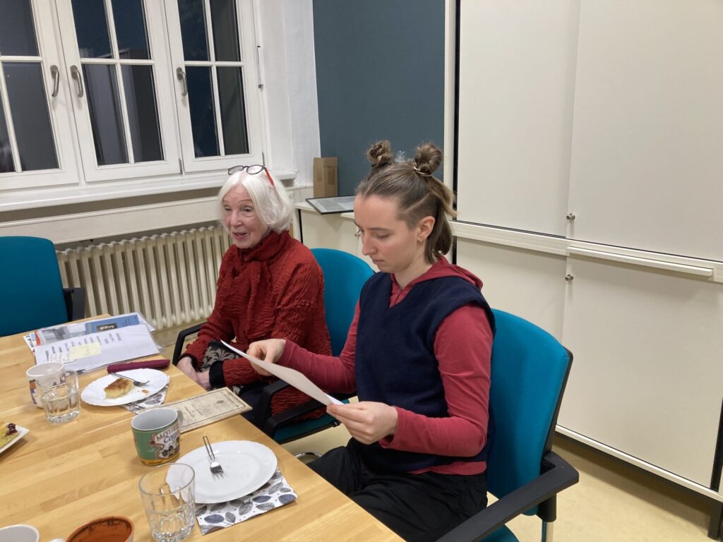 Bei einer gemütlichen Kaffeetafel und bei frisch gebackenem Kuchen tauschten sich die Gäste mit Schulleitung und Lehrkräften aus. Besonders aufschlussreich war das gemeinsame Sichten alter Unterlagen und Fotografien, die einen spannenden Blick auf die Vergangenheit eröffneten und uns einen noch tieferen Zugang zu den Wurzeln unserer Schule ermöglichten. Im Gespräch erzählte Frau Risch viel über ihre Großeltern und deren Bemühungen um die Gründung der Schule.